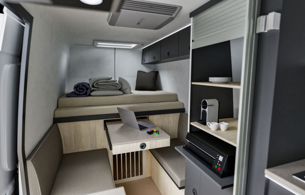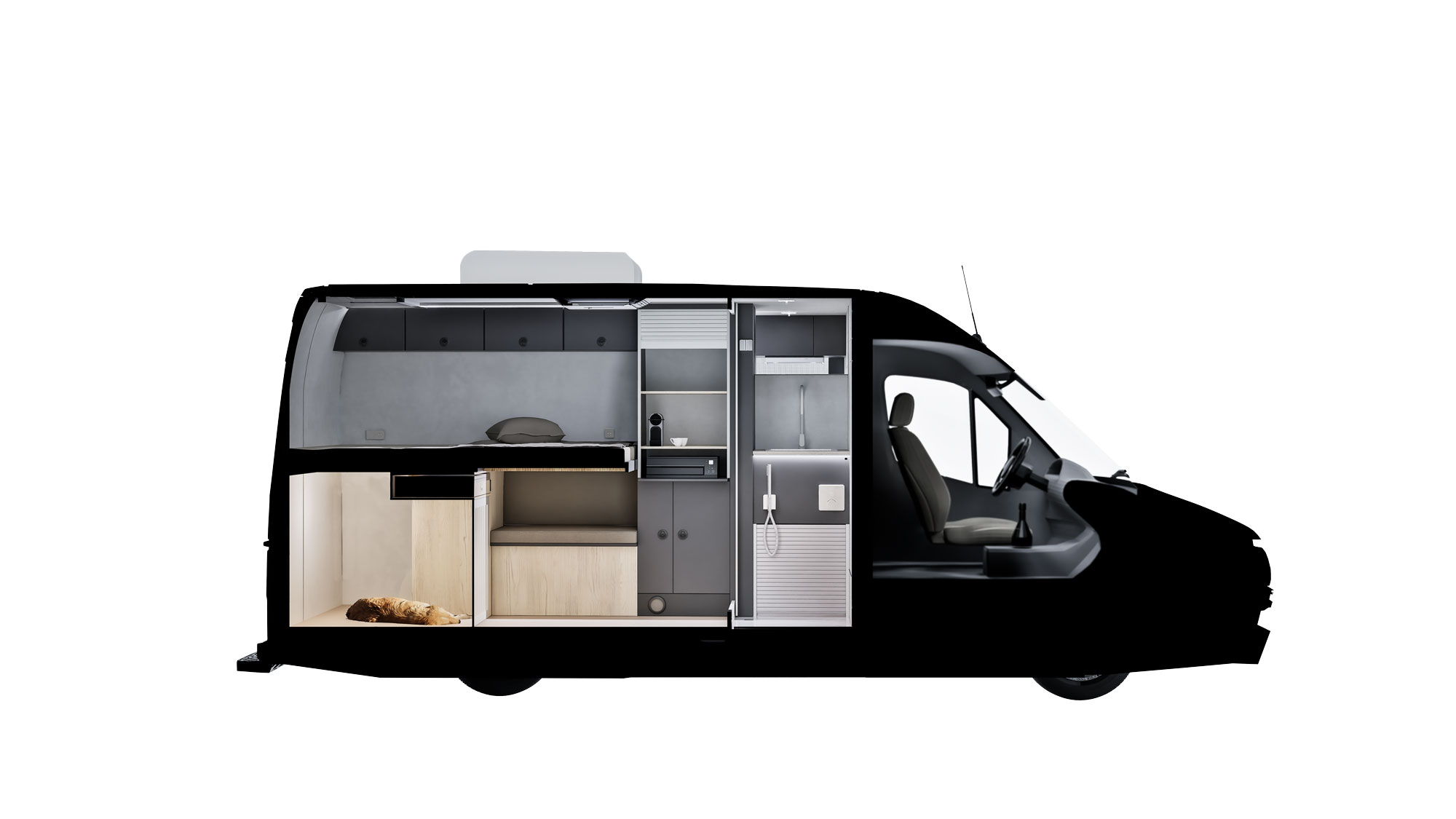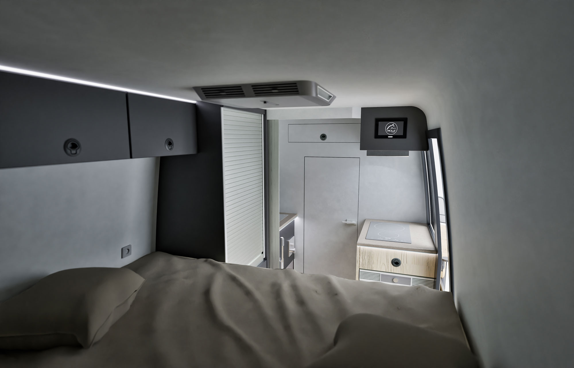 Wie der MULE 632 WORK basiert der MULE 632 TRAVEL auf einem Mercedes Sprinter 4x4 mit 5,99m Länge, Hochdach mit Stehhöhe 1,90m und wahlweise 3,50t oder 3,88t höchstzulässigem Gesamtgewicht. Der MULE 632 TRAVEL bietet zwar Raum für einen Arbeitsplatz, seine wahre Bestimmung liegt jedoch darin, ein aufwändig und in Präzisionsarbeit ausgestattetes Reisemobil für zwei Personen zu sein. Kompakt, unauffällig und dennoch ein Zuhause auf vier Rädern mit dem Komfort von endlos Warmwasser, extremer Autarkie, viel Stauraum und vielem mehr. Tagsüber bietet er eine Face-to-Face-Sitzgruppe für zwei Personen, nachts ein bequemes Längs-Ausziehbett mit 160x 190cm. Besonderes Highlight für alle, die mit vierbeinigen Familienmitgliedern reisen: Wohnbereich und Heckstauraum sind mit einer Gittertür verbunden. Mitreisende Hunde sind hier bestens aufgehoben. Ist dafür kein Bedarf, wird eine vollflächige Tür anstatt der Gittertür eingebaut und der rückwärtige Stauraum kann vom Heck aus mit Fahrrädern, Boxen und Gepäck beladen werden. Direkt hinter der Fahrerkabine liegt quer das Badezimmer mit Edelstahlwaschbecken und Grohe Smart Control Duscharmaturen. Die technische Ausstattung kann sich sehen lassen: Der MULE 632 TRAVEL verfügt über einen Multifunktionsdrucker, Starlink-Vorbereitung, eine Mastervolt Stromanlage mit 460Ah Lithium, 3000W Wechselrichter, 100A Ladebooster, eine BUS-Steuerung mit 7"-CZone-Display, einen Staubsauger, eine dreifach verglaste Hünerkopf Sicherheitsdachluke sowie Gassensoren. Waschtrockner und Bayernluft Raumlüftung sind optional.
